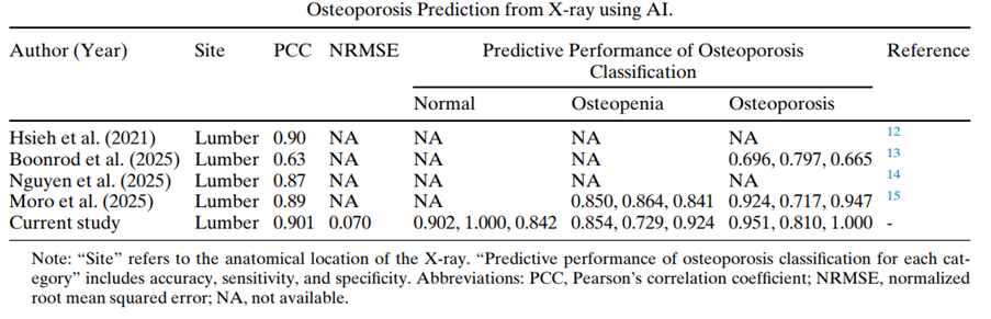 - Độ đặc hiệu (Specificity) đạt 1.000: Đây là chỉ số cao nhất trong bảng so sánh. Điều này đồng nghĩa với việc AI loại bỏ hoàn toàn khả năng báo dương tính giả (false positive) cho nhóm bệnh nhân loãng xương.