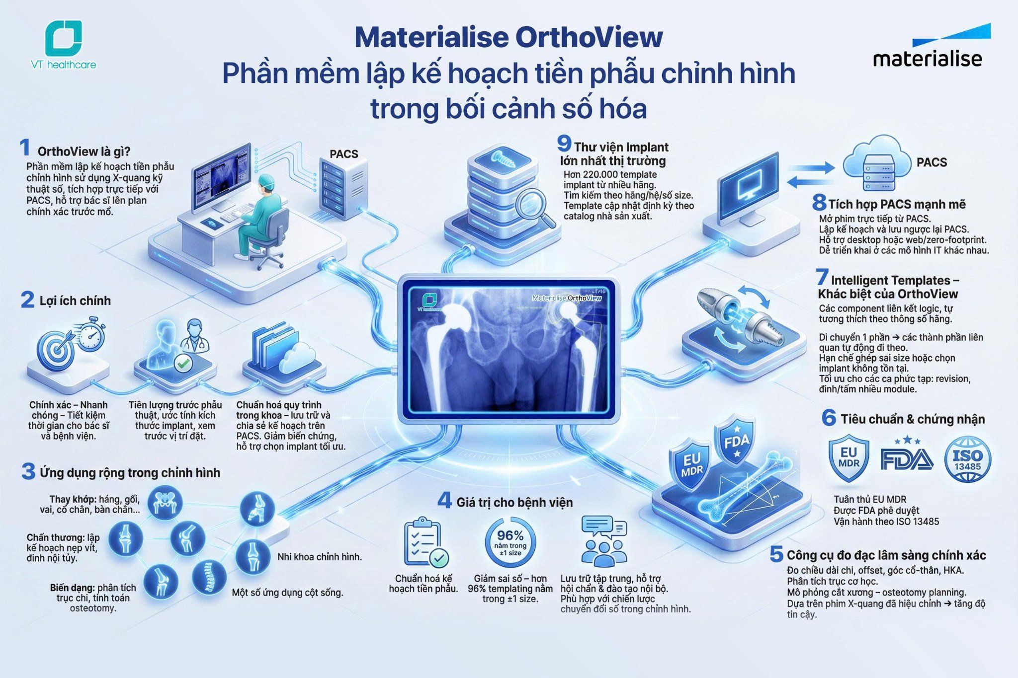 Materialise OrthoView, giải pháp lập kế hoạch tiền phẫu chỉnh hình hàng đầu thế giới, mang đến bộ công cụ mạnh mẽ cho tất cả chuyên khoa trong lĩnh vực chấn thương chỉnh hình, hỗ trợ bác sĩ từ thay khớp, chấn thương, chỉnh hình biến dạng đến nhi khoa và cột sống. Với thư viện template thông minh khổng lồ, độ chính xác cao và khả năng tích hợp liền mạch với PACS, OrthoView giúp tối ưu quy trình lâm sàng, nâng cao chất lượng điều trị và tiết kiệm thời gian cho bệnh viện.