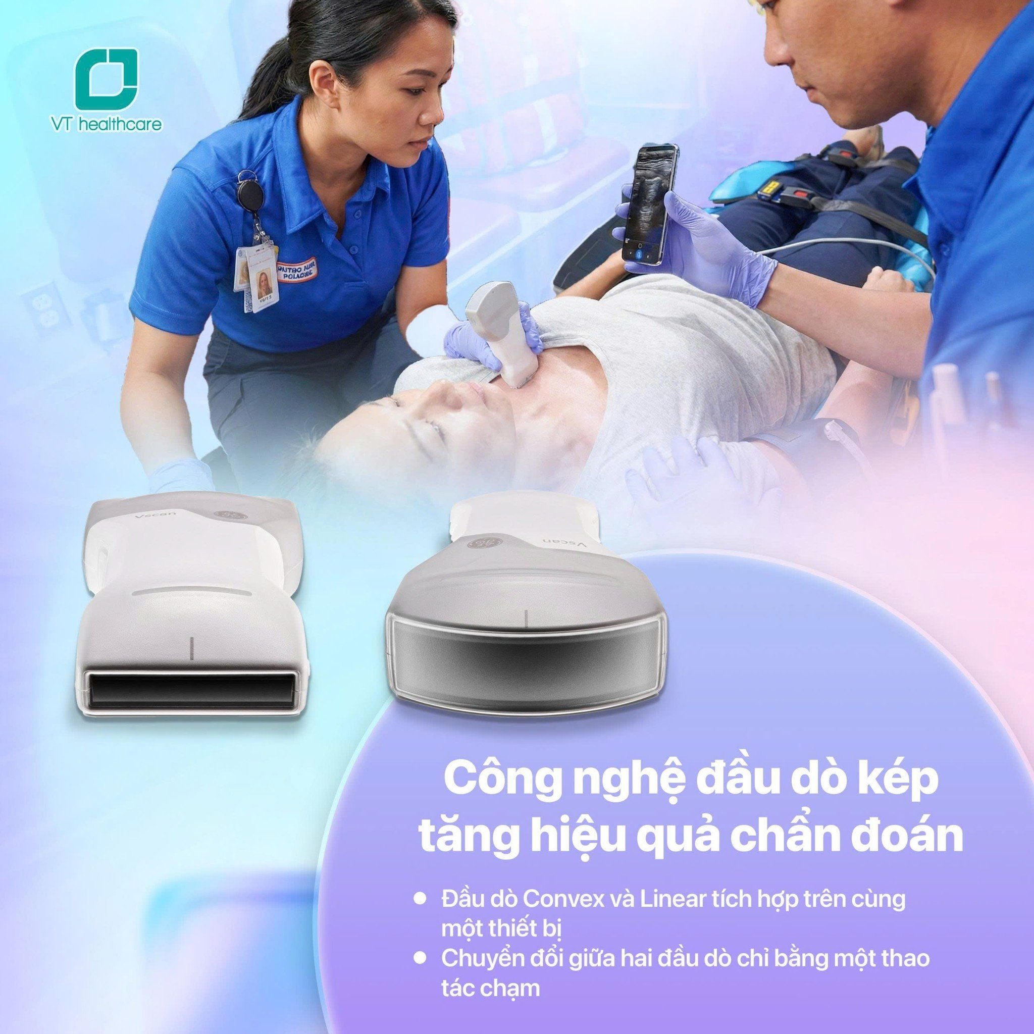 | Máy siêu âm cầm tay Vscan Air tích hợp hai đầu dò trong một thiết bị (Convex + Linear hoặc Sector + Linear) cho phép chuyển đổi nhanh giữa các chế độ mà không cần thay đầu dò.