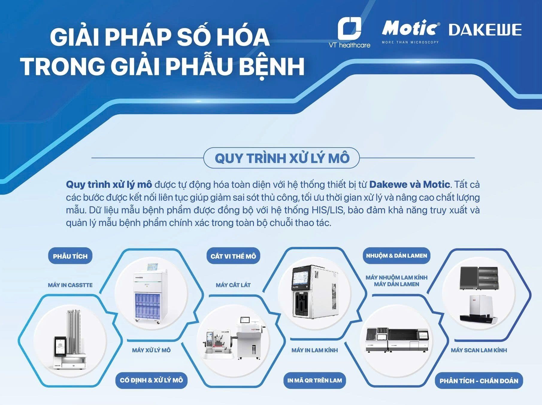 Tại Hội nghị, VT healthcare giới thiệu giải pháp số hóa toàn diện trong giải phẫu bệnh, tích hợp hệ thống thiết bị từ Dakewe và Motic, hướng đến tự động hóa toàn bộ quy trình từ phẫu tích đến phân tích chẩn đoán:
