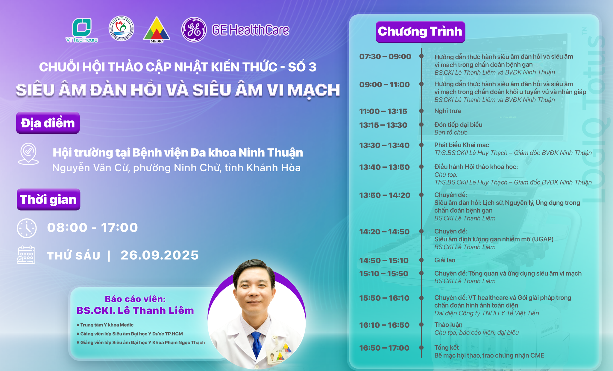 Nhằm giúp đội ngũ y tế cập nhật kiến thức chuyên môn và tiếp cận công nghệ mới nhất, VT healthcare phối hợp cùng GE HealthCare và Bệnh viện Đa khoa Ninh Thuận trân trọng tổ chức hội thảo chuyên đề: Siêu Âm Đàn Hồi & Siêu Âm Vi Mạch.