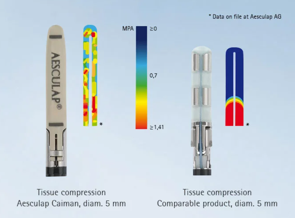 Caiman sở hữu thiết kế độc đáo với cơ chế đóng mũi đầu ngàm trước (“tip first closure”) chống trượt mô, đồng thời phân bố lực ép toàn bộ chiều dài hàm, giúp vùng hàn mạch luôn được đóng kín hoàn toàn, không có điểm yếu.