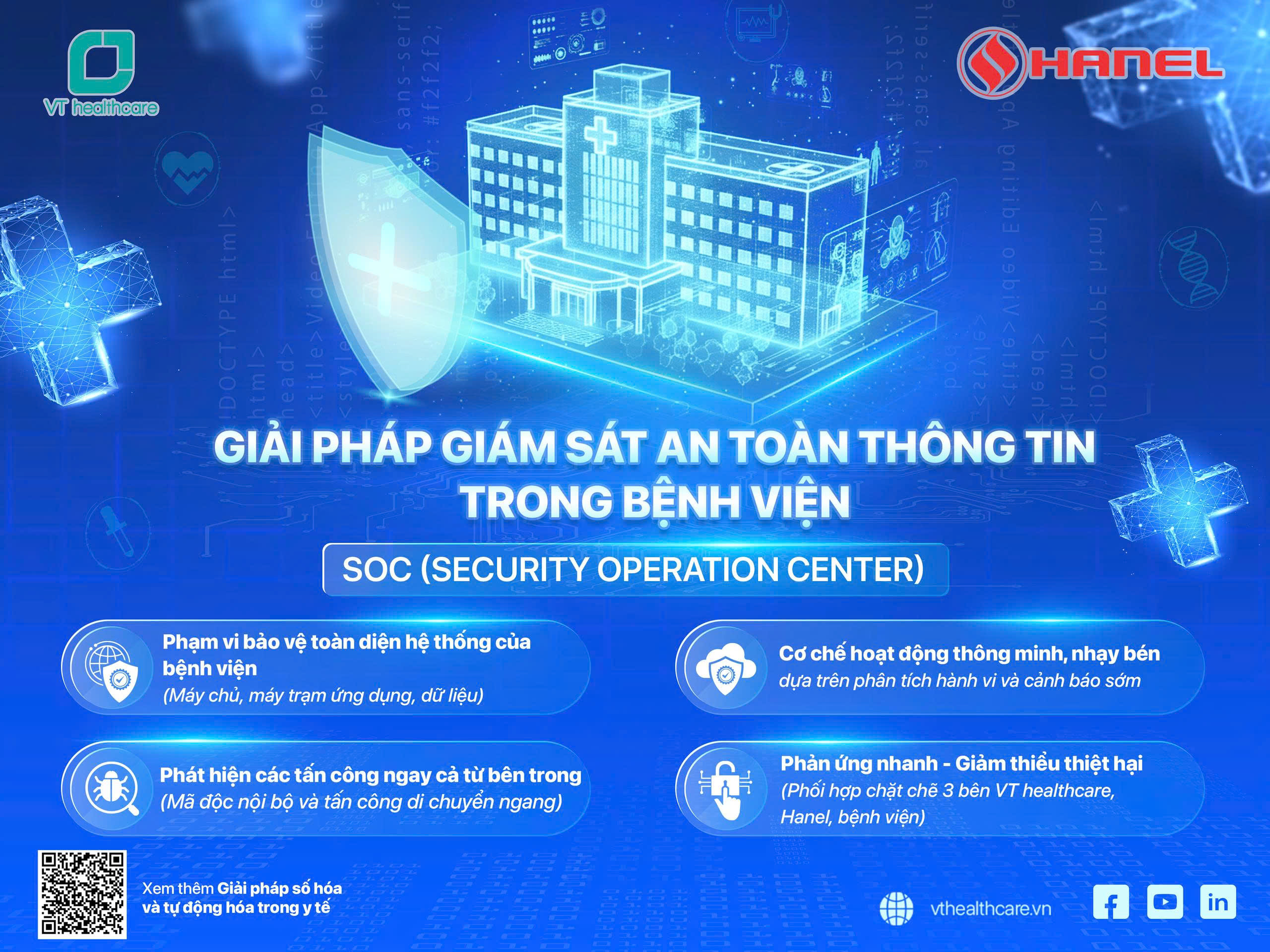 VT healthcare phối hợp với Hanel – đơn vị tư vấn an toàn thông tin trong y tế của Bộ Y tế – để cung cấp Giải pháp Giám sát An toàn Thông tin SOC (Security Operation Center) được thiết kế chuyên biệt cho môi trường bệnh viện, giúp tăng cường khả năng giám sát, phát hiện và phản ứng sự cố an ninh mạng một cách kịp thời và chính xác.