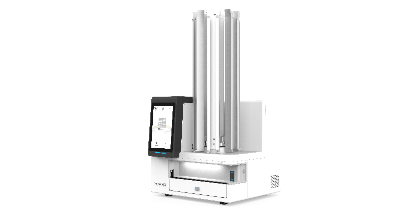 SurePrint C100 là phiên bản cao cấp hơn, được thiết kế cho các phòng thí nghiệm có khối lượng công việc lớn. Máy có 6 khay nạp cassette bằng hợp kim hàng không, tổng dung lượng lên đến 600 cassette, cùng khay đầu ra chứa được 100 cassette. C100 tích hợp cảm biến RGB nhận diện màu cassette, cho phép in tự động theo màu được cấu hình trước. Máy có thể hoạt động độc lập hoặc kết nối với LIS/HIS/PACS, hỗ trợ quét mã vạch trực tiếp từ phiếu xét nghiệm hoặc túi mẫu. C100 còn có đèn trạng thái, đèn khay, và chức năng cảnh báo thông minh, giúp người dùng theo dõi tình trạng thiết bị dễ dàng.
