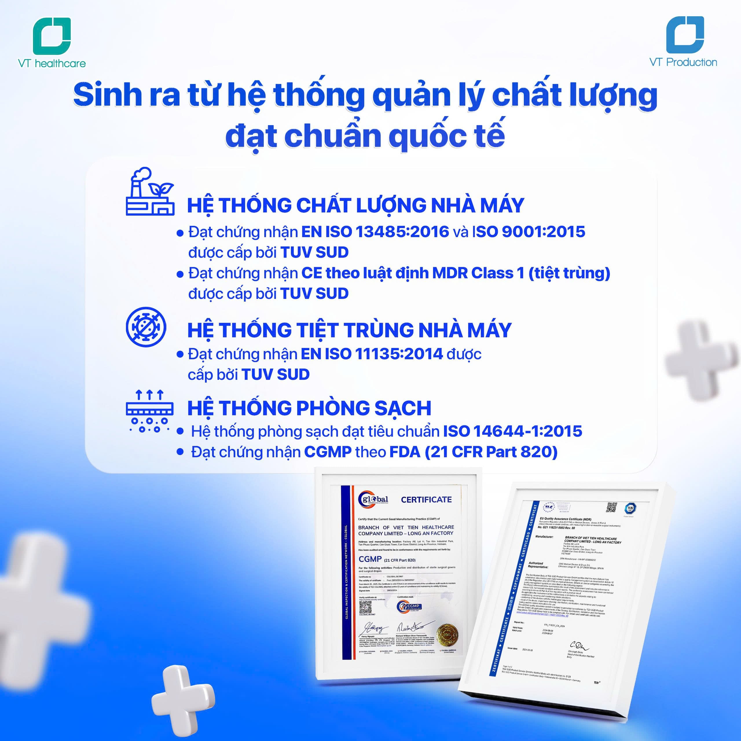 Điểm khác biệt lớn nhất của VT Production nằm ở hệ thống chuẩn hóa chất lượng. Không chỉ đạt chuẩn trong nước, VT còn đạt loạt tiêu chuẩn quốc tế mà ít nhà sản xuất Việt Nam nào có được: