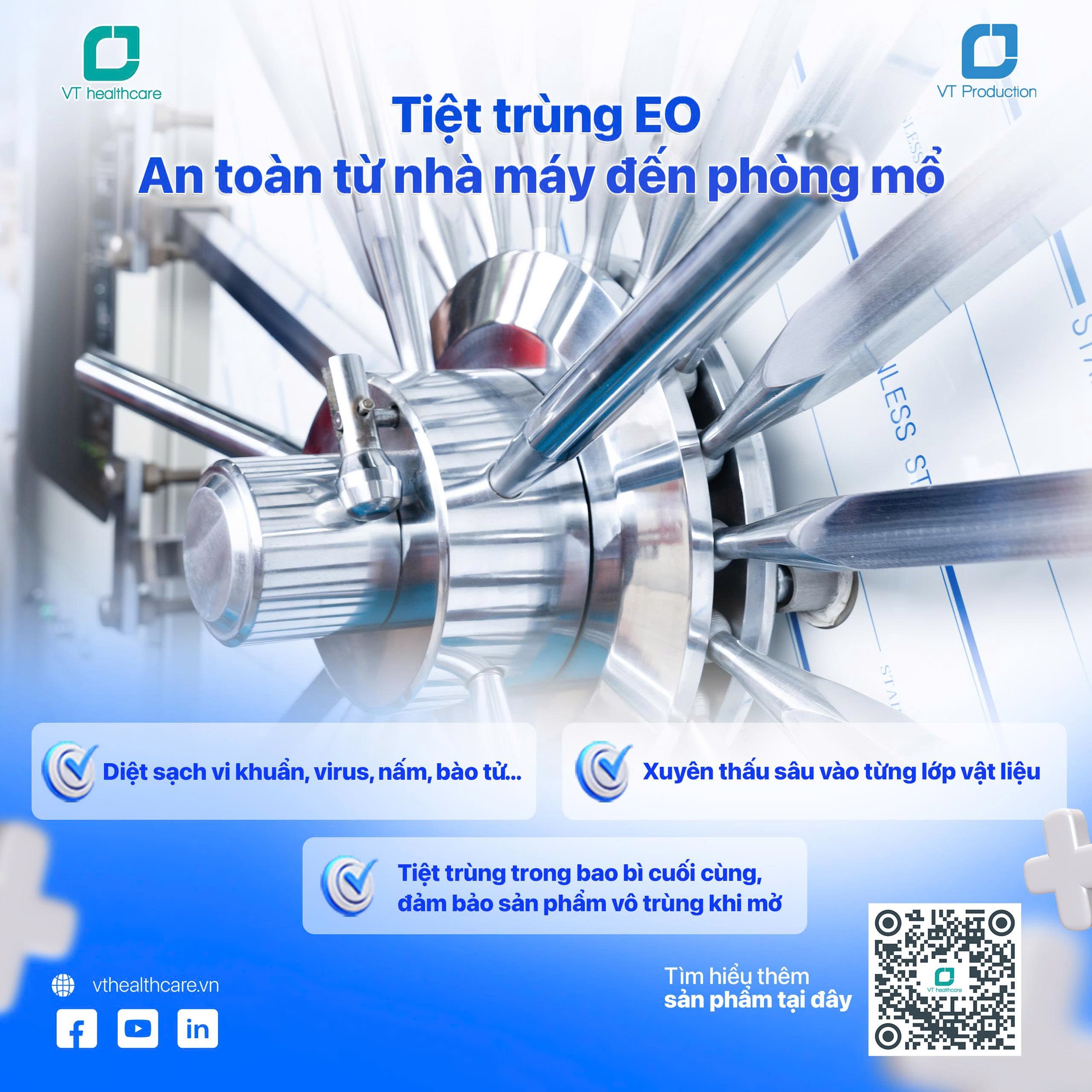 Tất cả khăn – áo phẫu thuật VT Production đều được tiệt trùng bằng khí EO (Ethylene Oxide) – công nghệ đang được các hãng thiết bị y tế hàng đầu thế giới áp dụng.